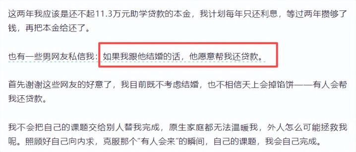 但是她的内容里显示,竟然有人说让她做他女朋友就帮她还这11.3万本金。笔者想说的是,这帮人太看不起博士了,11.3万,即便是文科博士,一年也轻轻松松赚出来了,要是这个女生真的因为这个缘故嫁人,那才是悲哀。