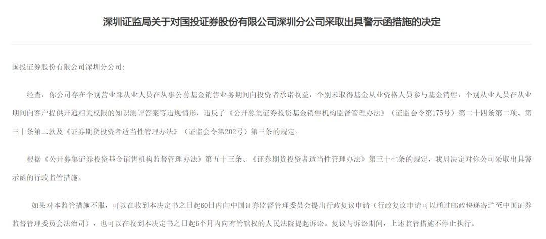 根据《公开募集证券投资基金销售机构监督管理办法》第五十三条、《证券期货投资者适当性管理办法》第三十七条的规定,深圳证监局决定对国投证券深圳分公司采取出具警示函的行政监管措施。